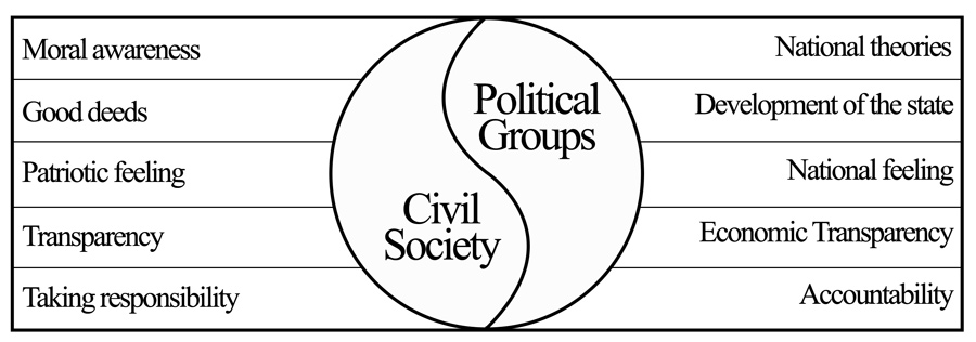 Civil societies and the political groups have been fragmented into the different portions even though they are in the same mass or the circle according to the mentioned figure. The duties of peoples’ group and the political aspects have been seen equaled each other even if they are in such different sizes. That kind of conclusion can be clarified with the existence of patriotic political parties or transparency and disciplined society. Anticorruptology inspires the party leaders to reach this goal.