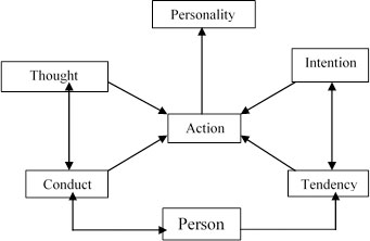 Human action is determined by his/her intention, tendency, conduct and thought. The action of an individual determines personality. If person’s conduct, thought, intention and tendency are good, his/her actions turn out good. When action is good his personality is also shaped accordingly. This fact is shown in the above figure.