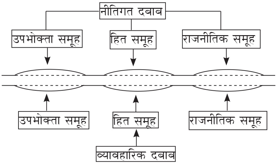 उपर्युक्त समूहहरूले दबाब सृजना गर्दा नीतिगत दबाब तथा व्यावहारिक दबाब दुई तरिकाले सम्बन्धित निकायलाई दबाब सिर्जना गरी त्यस निकायलाई आफ्नो स्थिति (क्ष्शभ) मा राख्न सक्नेछ भन्ने तथ्यलाई तलको चित्रतालिकाबाट हेर्न र बुझ्न सकिन्छ ः
