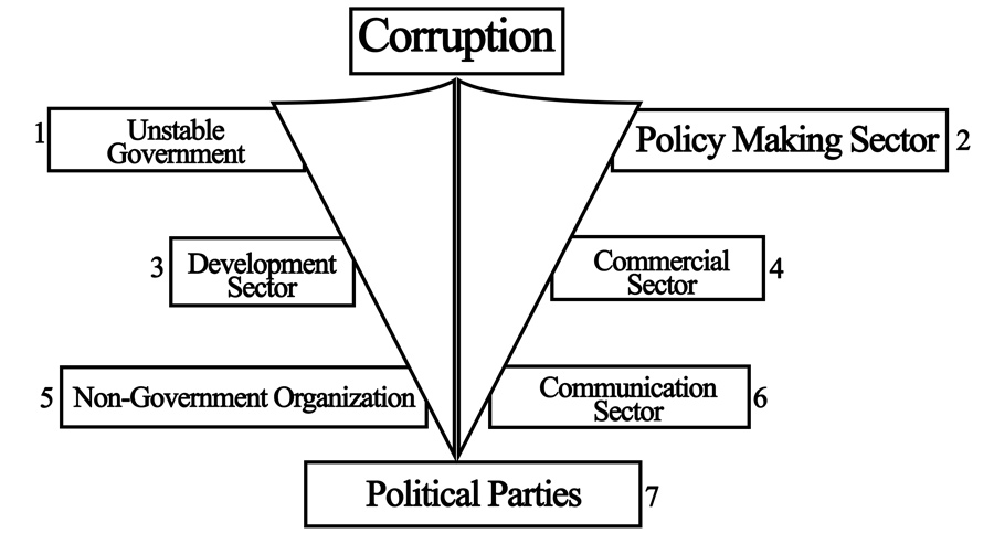 The political parties in almost all countries of the world have developed their own political areas. They have gained their political status in the country. A few political parties are active in developed countries. On the country, hundreds of political parties try to gain political status with active role in the developing countries. The political situation of the countries which have maximum number of active political parties remains highly unstable. The more number of political parties the higher the increase in the ratio of instability will emerge. When politics is unstable, the parties start to weaken the state fund and collect property in their fund when they get chance to execute state affairs. The parties which are outside the government come to the opposition against the loot of the state fund by the ruling parties. The corrupted political party in power is toppled from the power and another party joins the government. That party also collects property from state fund. So it also cannot stay longer and is overthrown from the government. In this way , only political parties have right to form the government .As a result , from a few parties to several parties always hurry to form coalition government and even a small dispute causes to dissolve the government .The political parties experiment to come in and fall back from government in developing countries. As a result, the plan and policy making agencies are also associated with the ruling political party. There appears interference in small to large development projects from local to national levels. The business sector becomes miserable due to inflation in internal and foreign trade. The NGOs within the countries are influenced by the interference of International Non-Governmental Organizations. Similarly, communication sectors get distracted from ethics and morality and present themselves as proclamatory journal. The cunning people of a country who are divided into various parties and run so many parties cannot handle the politics of that country. Cunning people operate political parties in the developing countries. The politics where those people are active is polluted. The polluted political sector prompts the corruption in the country.