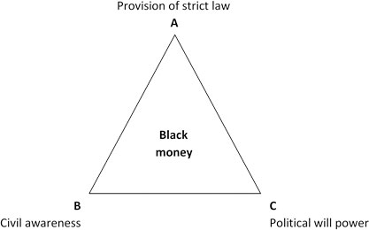 The above triangle has A, B and C dominated by black money. The strict laws that are implementable along with public awareness and the political leader’s willpower corrodes the corruptive activities. If A, B and C are active, they dissuade people to make black money.