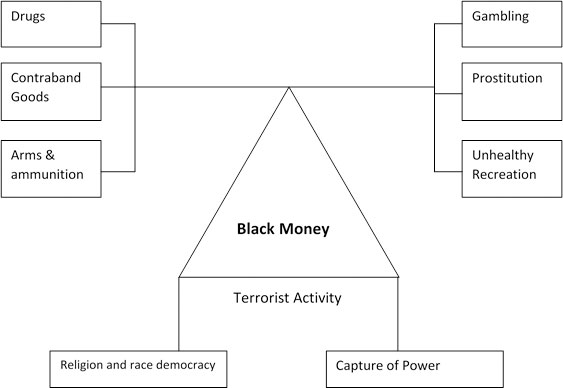 The laundering of black money is similar in all countries. This type of money is used in buying and selling of contraband goods, services and materials. In most of the developing countries, this type of money is spent in political transformation. In some countries, black money is used to mobilize terrorist activities. Therefore, the black money play a significant role in the transformation of state power of developing countries. All the governing person, agencies have accepted this fact. But this bitter reality cannot be disclosed in front of the general public.